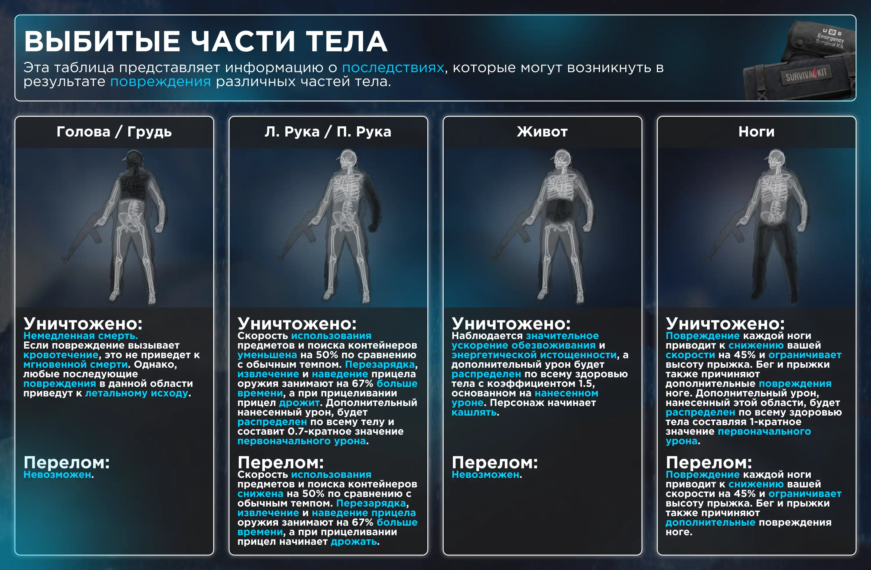 Punched body parts, table with information.