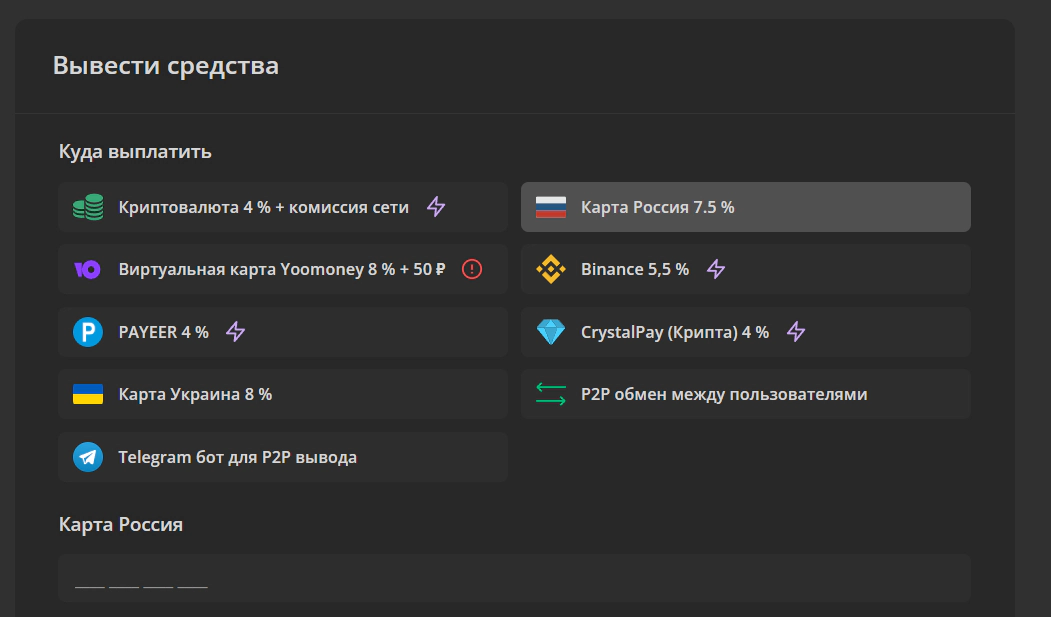 Вернули стабильные выводы на карту РФ (не P2P) с комиссией 7.5%. В вечернее время выводы могут не работать и выплата придет утром (это ограничение провайдера услуги).