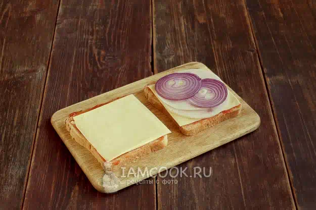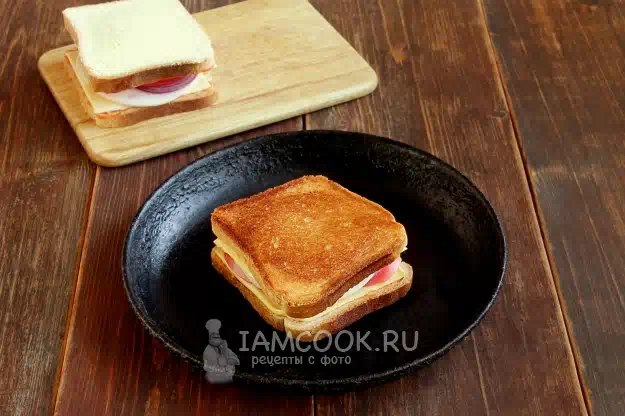Плюс нарезанный тонко помидор. Соединяем две части сэндвича, начинкой внутрь. Кладем на горячую сковороду и поджариваем с нижней стороны 1,5-2 минуты (до золотистой корочки).