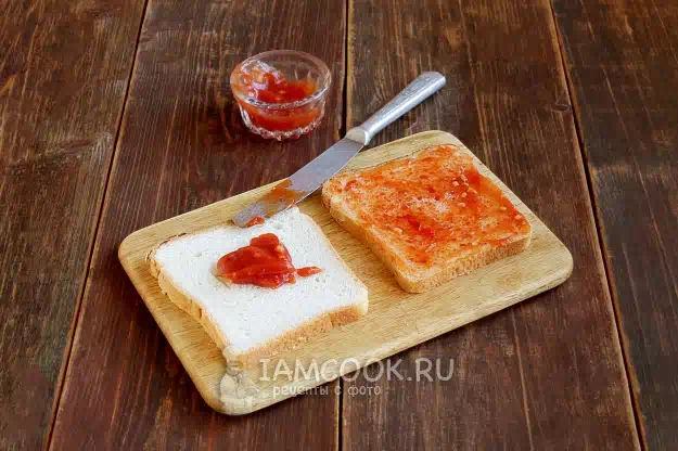 Смазываем тостовый хлеб мягким сливочным маслом без пробелов. Переворачиваем.