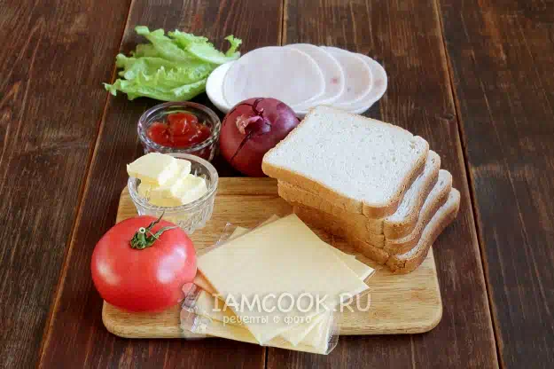 Для приготовления домашних сэндвичей с ветчиной и сыром возьмем продукты по списку. Начинка - на ваш выбор, но обязательно с сыром, каким-нибудь соусом, мясными изделиями.