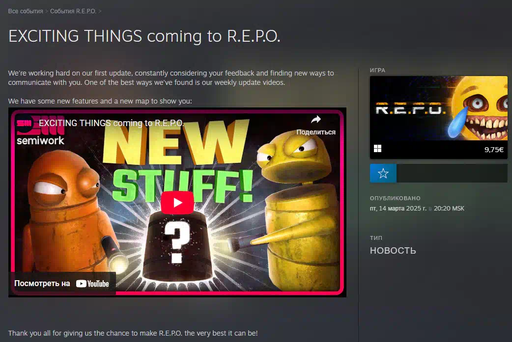 Для R.E.P.O. готовят первое большое обновление