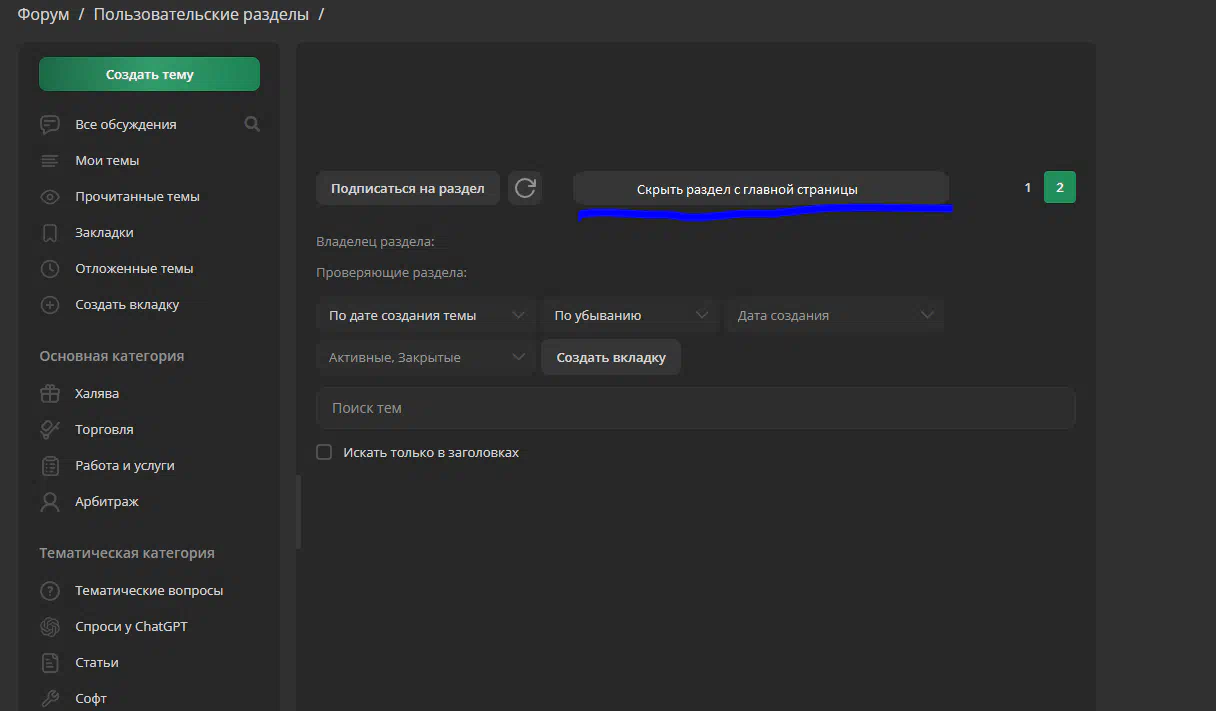 Add the "Hide section from the main page" button