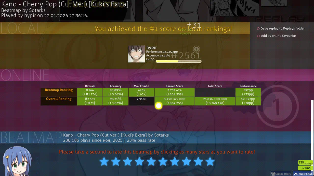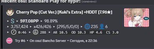 Карта: https://osu.ppy.sh/beatmapsets/2464474#osu/5394968 +28 и вернул 12к пп Реплей: (https://link.issou.best/KcS1kX если не грузится) Игрок: https://osu.ppy.sh/users/12991016 (я)